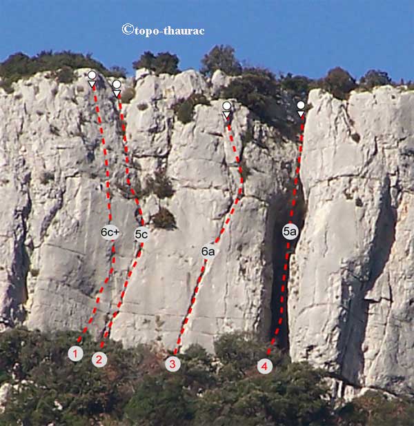 1) Redescente Climatisée (Serge Nurit) Rééquipement en goujons de 12mm. Plaquettes inox Petzl 2) Le Rivage des Syrtes (J.-M. Poirier) 2008 Equipement en goujons de 10mm. Plaquettes Fixe 3) Escarboucle (J.-M. Poirier) 2008 Equipement en goujons de 12mm. Plaquettes Petzl 4) La Goule du Diable (J.-M. Poirier) 2008 Cheminée équipement en goujons de 10mm. Plaquettes Fixe.