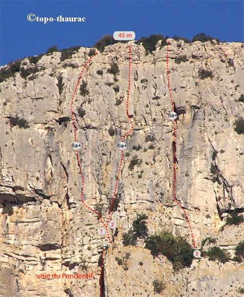 Voies situées à la sortie de la voie du "Pendentif "(voie numéro 25) attaque à partir de la vire. 1) Pinsut (P. Escande, C. Verdeil) 2) Zoreille (P. Escande, C. Verdeil) 3) Mzougou (P. Escande, C. Verdeil) Pour les voies 1 et 3 prévoir des grandes sangles pour l'assurage sur des arbres en sortie de voie.