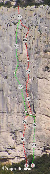 Première longueur (J-M. Poirier, S. Cayrac) non équipée, en place un piton, nécessaires 6 pitons, coinceurs, friends.