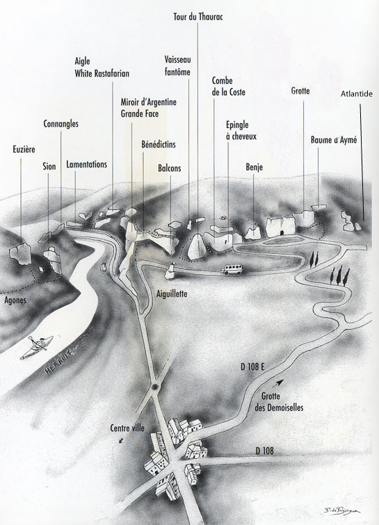 PRESENTATION Le plateau du Thaurac forme un triangle d’environ 5 km2. Entouré de falaises, il culmine à 487 m, alors que son niveau de base, où coule l’Hérault, se trouve à 130 m d’altitude. Une des particularités du Thaurac, est de présenter une grande diversité de secteurs, d’orientations et de hauteurs variables. On peut ainsi y grimper toute l’année, en jouant avec le soleil en fonction de la saison. Le climat est de type méditerranéen supérieur,
